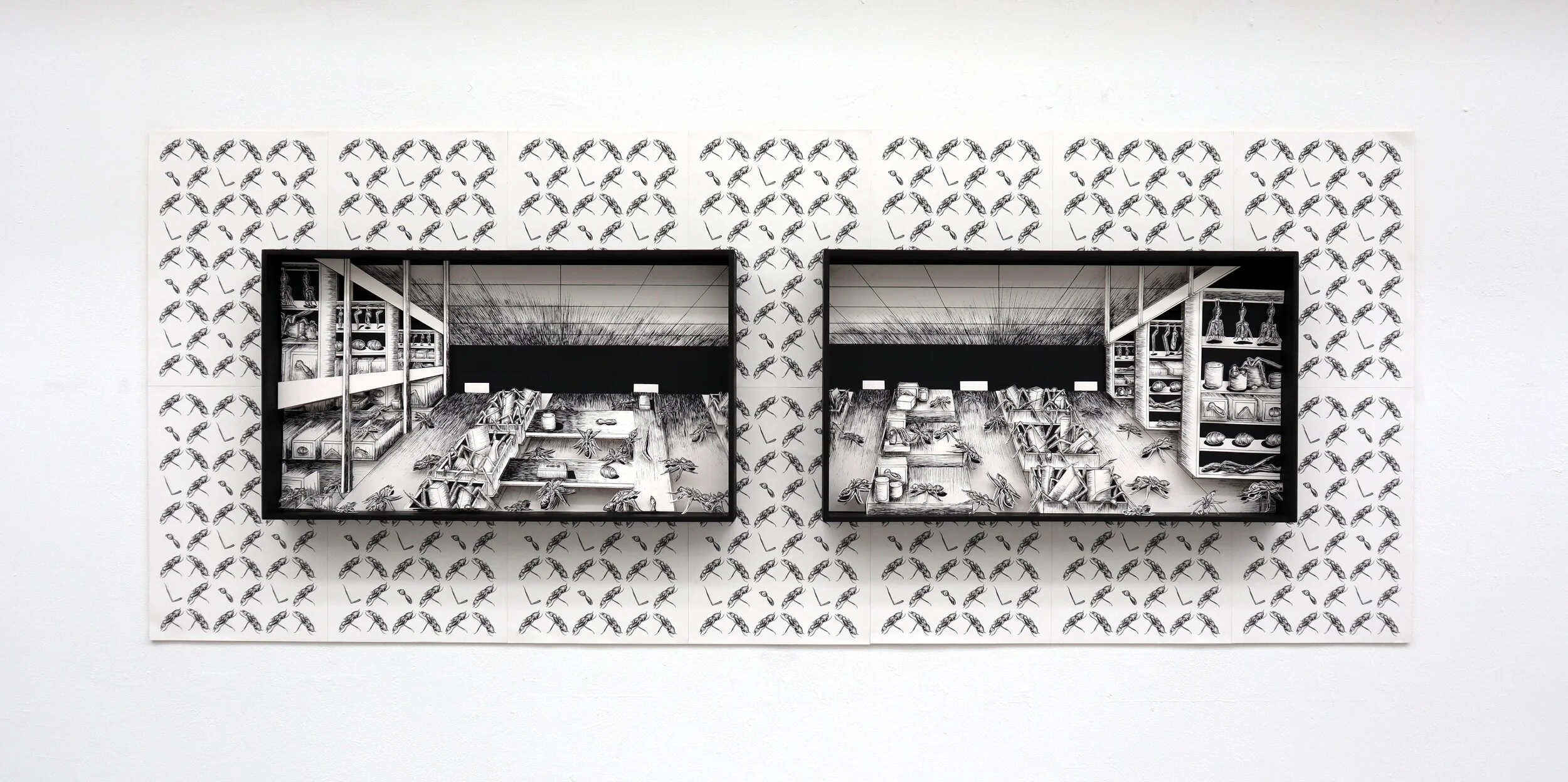 Having repetitive patterns made up of ants represent the cycle of no escape, the wallpaper entices the viewer into the artwork, trapping or influencing their perception of the space until they take a step back. Wallpaper links to our living space and by having my work displayed on wallpaper suggest that we are living in this never-ending cycle of consumerism.